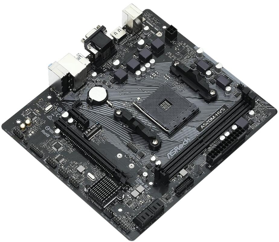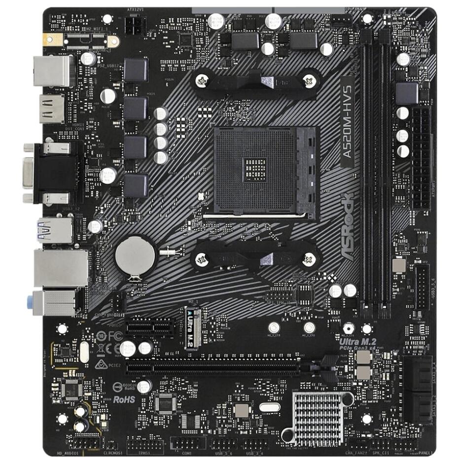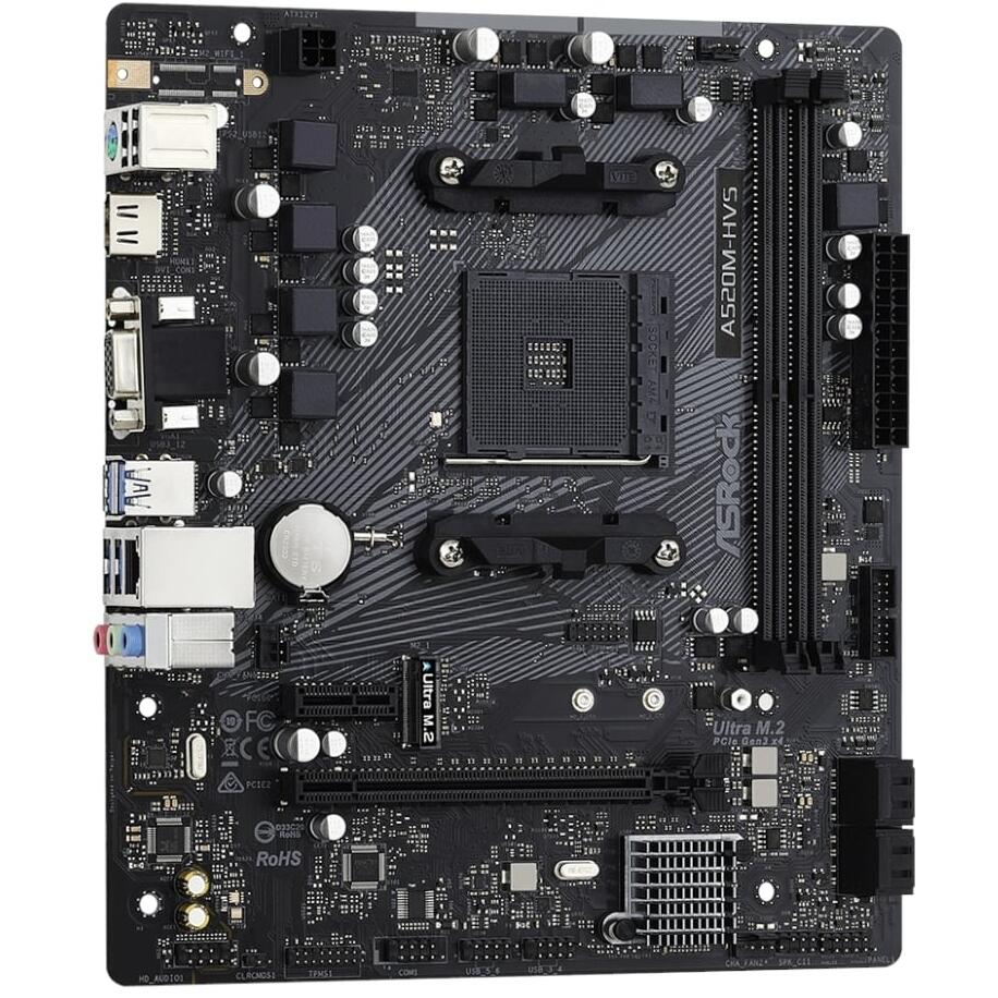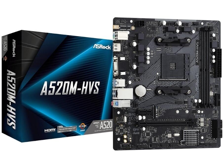 The ASRock A520M-HVS is a budget Micro-ATX AM4 motherboard built for cost-conscious Ryzen builds on the A520 chipset. Supporting AMD Ryzen 3000, 4000 G-Series, 5000, and 5000 G-Series processors with DDR4 up to 4733+ MHz OC, a PCIe 3.0 x16 slot, Ultra M.2 Gen3 x4 storage, and HDMI plus D-Sub display outputs, it provides a solid, dependable foundation for entry-level gaming and everyday desktop use.