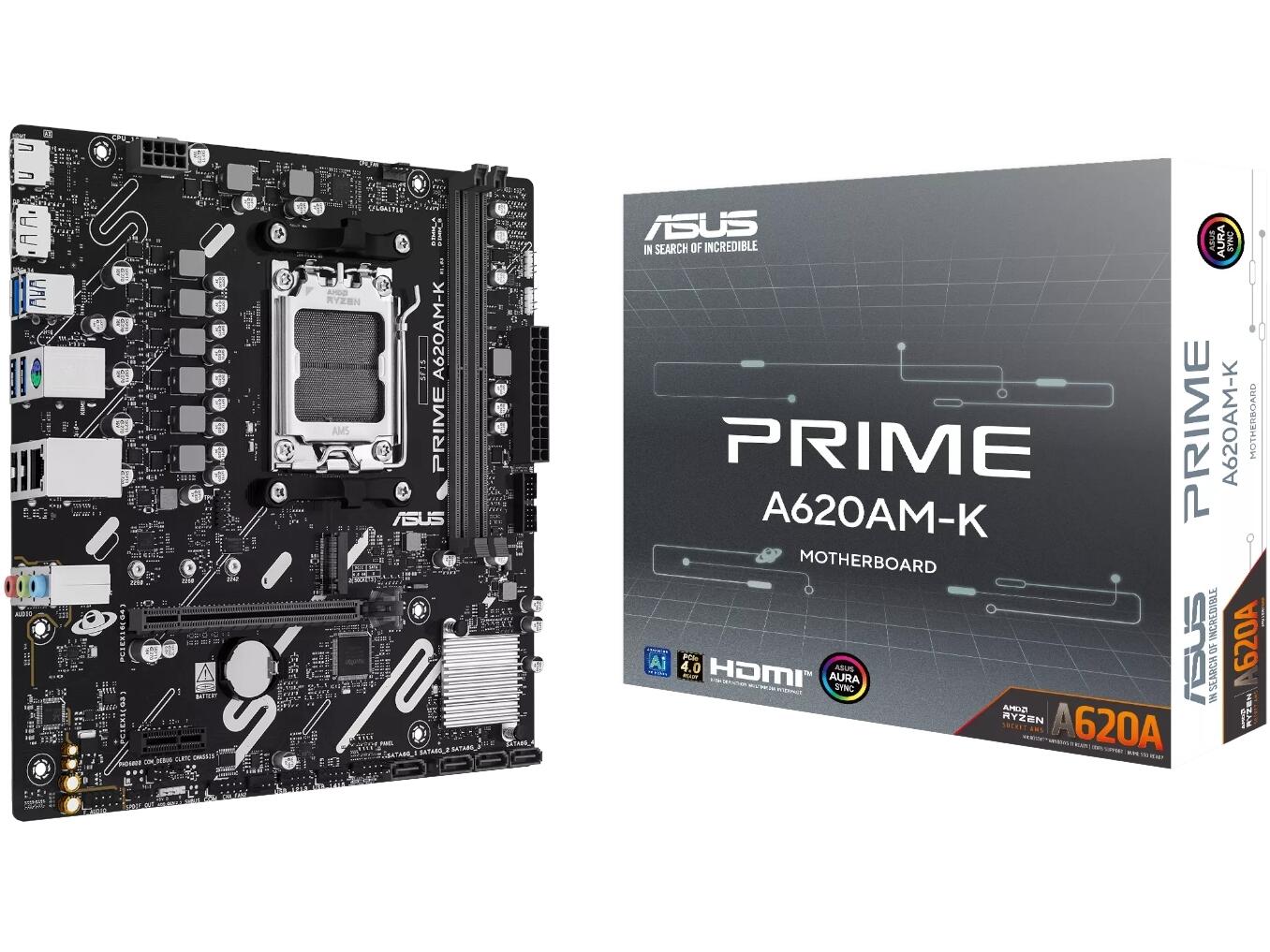 The ASUS Prime A620AM-K is an Advanced AI PC-ready Micro-ATX AM5 motherboard on the AMD A620A chipset, designed with a 6+2+1 phase digital power design for efficient and stable delivery to AMD Ryzen processors up to 120W TDP. DDR5 support up to 7200+ MT/s with Ryzen 9000 series, a PCIe 4.0 x16 GPU slot, PCIe 4.0 M.2 storage, and Aura Sync RGB round out a feature set that’s strong for its price tier.