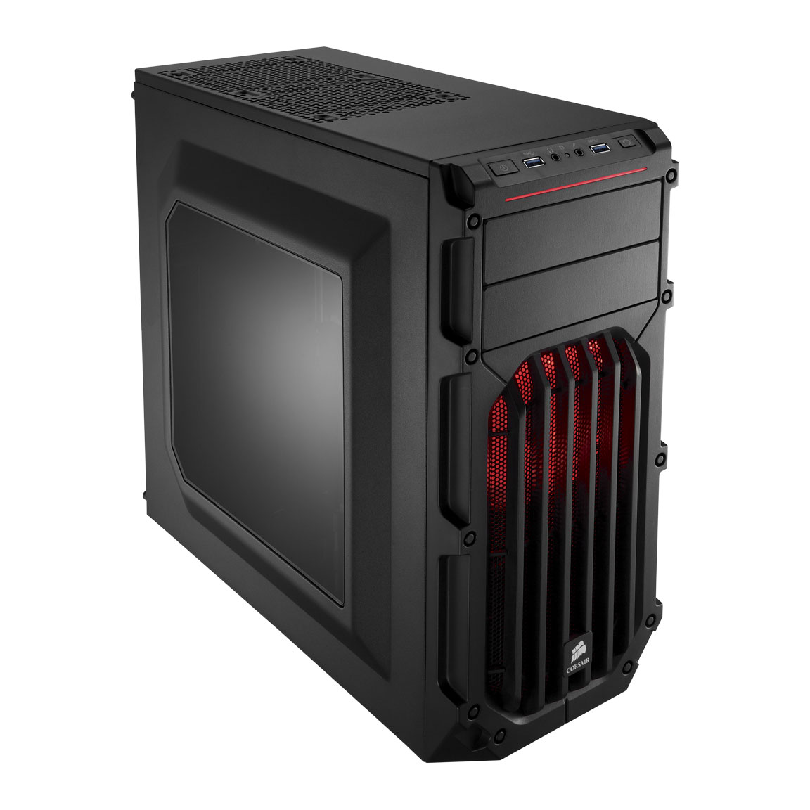 The SPEC-03’s interior layout is built with a clear priority: getting cool air across your graphics card. The two pre-installed 120mm orange LED front intake fans are positioned to pull air directly into the GPU zone, keeping temperatures in check during extended gaming sessions. The front panel is removable for cleaning access, and a dust filter behind it keeps debris out of the intake path. The design language is characteristically Corsair Carbide — bold contours, matte black finish, and a prominent front grille that communicates purpose without being garish.