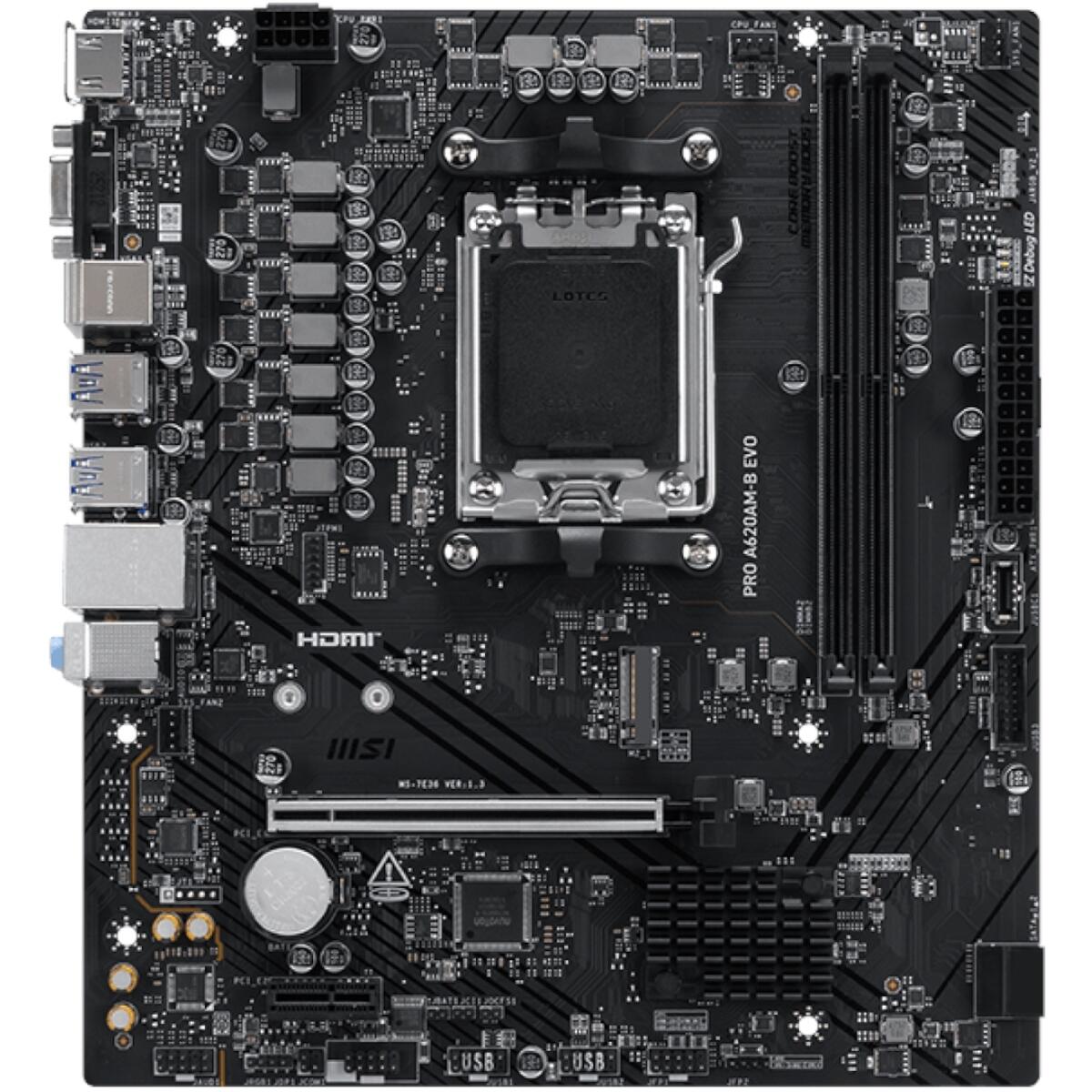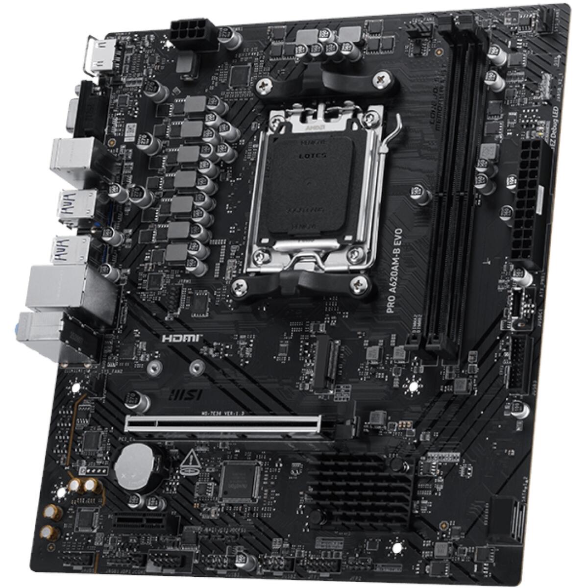 The MSI PRO A620AM-B EVO is a compact Micro-ATX motherboard built on the AMD A620A chipset supporting AMD Ryzen 9000, 8000, and 7000 Series processors on AM5, with MSI Core Boost technology for improved stability and DDR5 memory support up to 6800+ MT/s OC. A PCIe 4.0 x16 GPU slot, Gen4 M.2 NVMe storage, Realtek 2.5Gb LAN, and a USB 5Gbps Type-A rear port make it a surprisingly well-specified budget AM5 platform.
